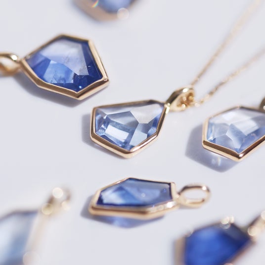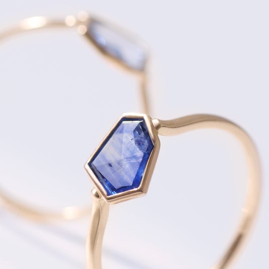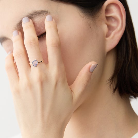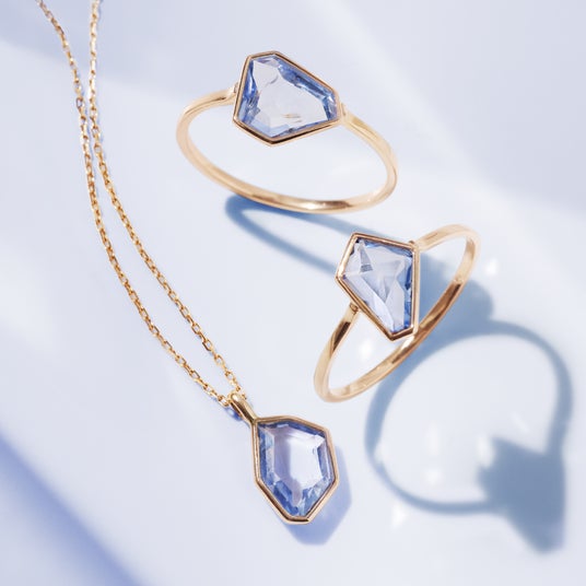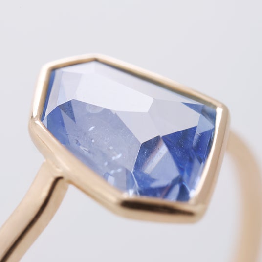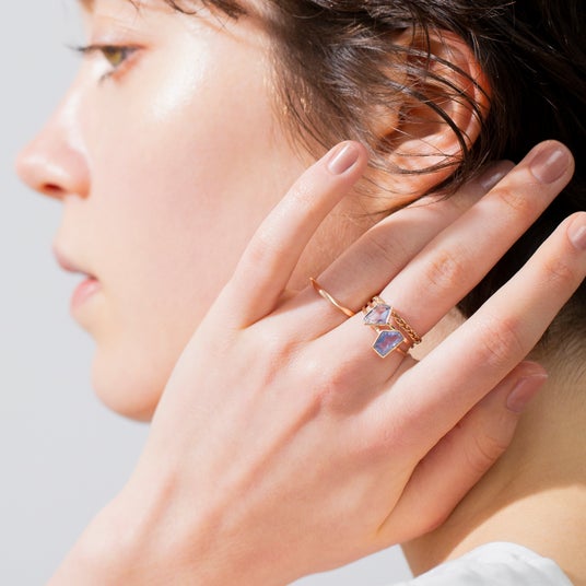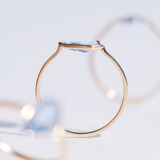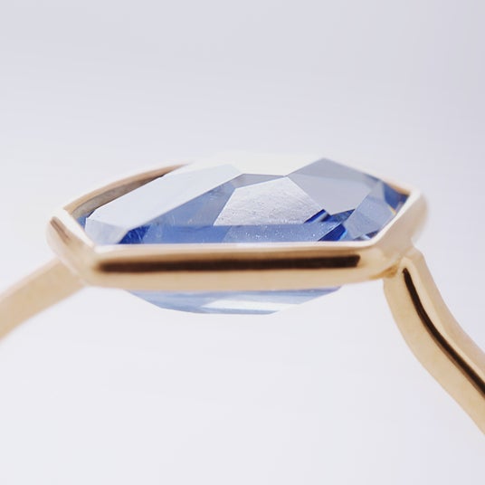 一般的に色の濃さを追求し厚くカットされることが多いサファイアを、あえて薄くカットすることで、心に静けさをもたらす淡いブルーの色彩を実現しました。さらに、ファセットカットを加えることで、上品で繊細な輝きが生まれます。