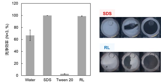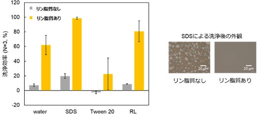 更に、皮膚常在菌である黄色ブドウ球菌のバイオフィルムをリン脂質で被覆した基板上に作成し、リン脂質の有無、多寡にかかわらず同等のバイオフィルムが形成されることを確認しました。このバイオフィルムをタイプの異なる界面活性剤の溶液で洗浄したところ、リン脂質の被覆率が増加するに従い洗浄効率が高くなることが分かりました(図2)。この結果は、リン脂質被膜がバイオフィルムの洗浄除去促進に有効であることを示唆しており、リン脂質をベースとした新しいスキンケア製品の開発への道を開くものと考えられます。