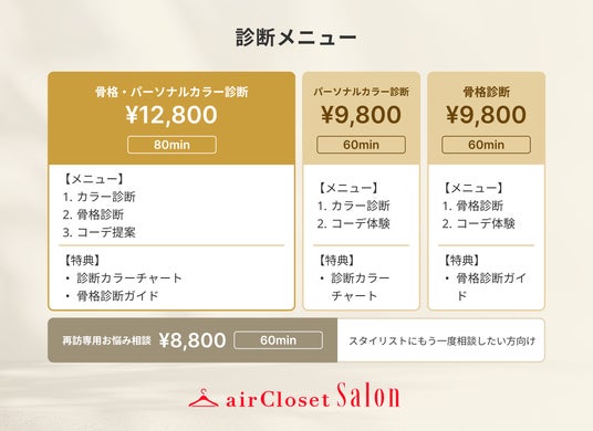 『airCloset Salon』では、「骨格・パーソナルカラー診断」「パーソナルカラー診断」「骨格診断」「お悩み相談(再訪用)」の4つのメニューをご用意。診断後にコーディネート提案をセットで提供するのが最大の特徴です。日常のファッションにどう取り入れるか、スタイリストが具体的にアドバイスするため、従来の診断で多くのお客様が抱えていた「結果の活用方法がわからない」という悩みを解消します。