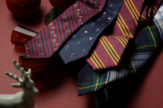 パーティーや休日にはもちろん、落ち着いた配色なのでビジネスの場でもさりげなくホリデームードを楽しめます。(左から)ホリデーモチーフタイ各¥19,800 ストライプ、チェック柄タイ各¥18,700(全て税込価格)