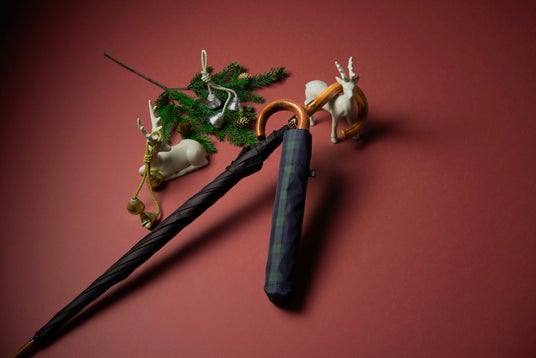 (写真右)クラシックなブラックウォッチ柄の折り畳み傘。手元木にはカエデを使用。表面に焼き加工を施し、ブラックウォッチ柄と相性の良い重厚感のあるアンティーク調に仕上げました。¥25,300(税込価格)