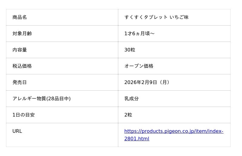 ピジョン株式会社(本社:東京、社長:矢野 亮)は、野菜が不足しがちな幼児期のお子さまに向けた「すくすくタブレット いちご味」を、2026年2月9日(月)より全国のベビー用品専門店・ドラッグストア、当社公式オンラインショップにて販売を開始いたします。
