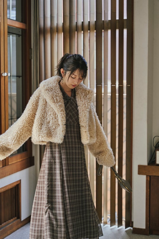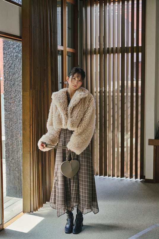 この冬は心ときめく甘いエッセンスを。ボリュームたっぷりのプードルファーにクラシカルなチェック柄を重ねて、大人スウィートなスタイリングに。