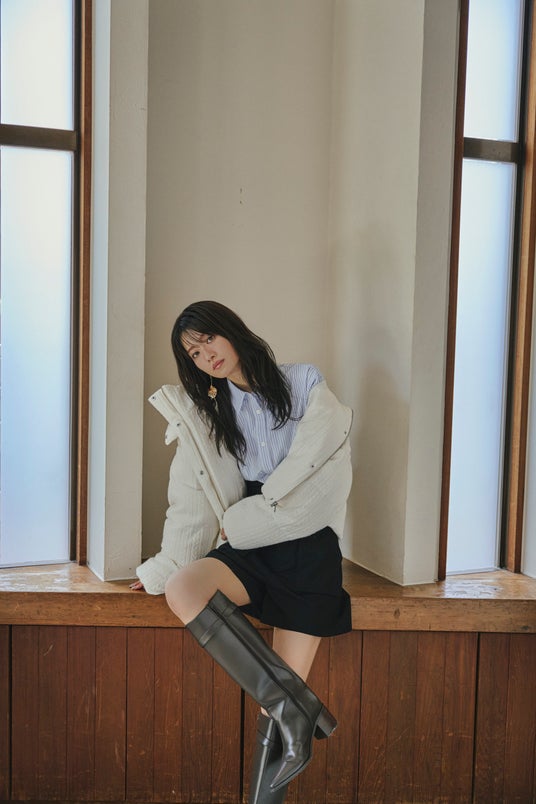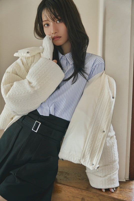 新鮮さに心躍る、最旬のエレメント。温もりが心地よいニットダウンは、ストライプシャツとのコントラストが今の気分にぴったりなバランスに。