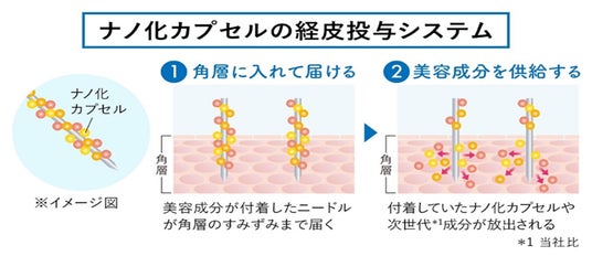 この研究では、加水分解カイメンを天然由来のマイクロニードル成分として利用し、これまでに開発したナノカプセル技術と組み合わせることで、新しい経皮吸収技術を開発しました。この技術を応用することで、お肌内部へのアンチエイジング効果を最大限に引き出し、コラーゲンとエラスチンの繊維の分解を抑制し、ほうれい線の改善を目指しました。