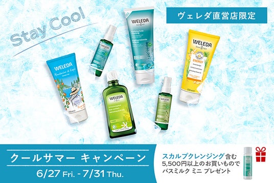 ヴェレダ直営店では、夏をすっきり爽やかにお過ごしいただくため、夏ケアにおすすめのアイテムをお買いあげの方にプレゼントを差し上げるキャンペーンを実施いたします。