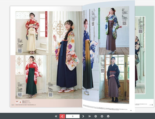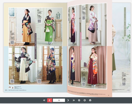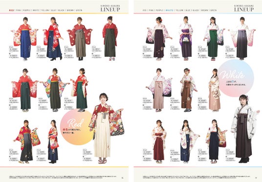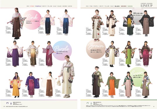 『袴パンフレット2026』では、着物・袴それぞれの魅力が引き立つよう、カラー別にわかりやすく構成しています。