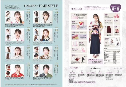 本パンフレットでは、卒業式当日の装いを具体的にイメージできるよう、袴に合わせたヘアスタイル提案ページを設けています。編み込みアレンジやシニヨン、ハーフアップなど、袴姿と相性の良い定番スタイルを紹介し、晴れの日のトータルコーディネートをサポートします。