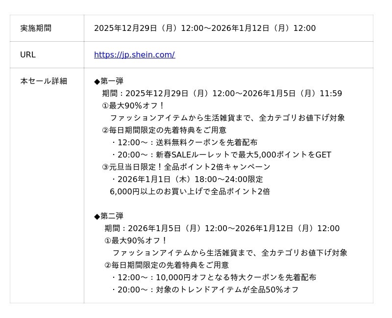 この機会に、新年のスタートを彩るお買い物をSHEINでお得にお楽しみいただき、2026年の始まりに新たな一歩を踏み出してみてはいかがでしょうか。