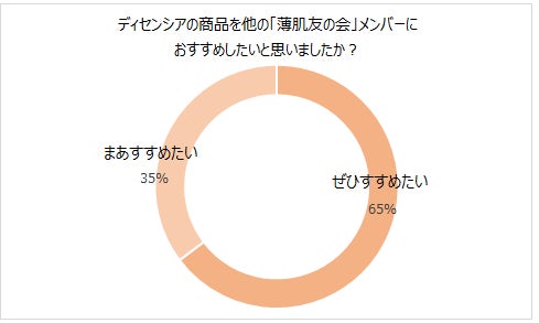 「ディセンシアの商品を他の「薄肌友の会」のメンバーにもおすすめしたいと思いましたか?」という質問では、全員が「ぜひすすめたい」「まあすすめたい」とご回答いただきました。ディセンシアの理念、商品をしっかり知っていただいたうえで、薄肌友の会メンバーにもマッチすると感じていただける方が多かったことが分かりました。