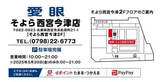 メガネ・補聴器を販売する「メガネの愛眼」「Aigan」 ( https://www.aigan.co.jp/ )を運営する愛眼株式会社(本社:大阪市天王寺区、代表取締役社長:佐々 昌俊)は、兵庫県西宮市で大規模リニューアルをした商業施設「そよら西宮今津」の2Fに「メガネの愛眼 そよら西宮今津店」を2025年5月30日(金)よりグランドオープンしましたことをお知らせいたします。