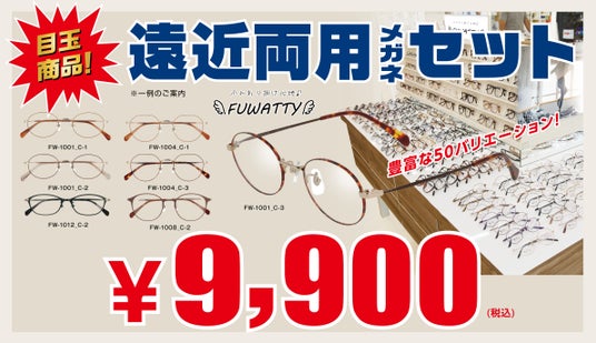 オープニング記念!お手軽メガネセットもご用意しました。遠近両用レンズ付きで¥9,900(税込)と大変お買い得。愛眼の遠近両用メガネで快適な視界を手に入れませんか?