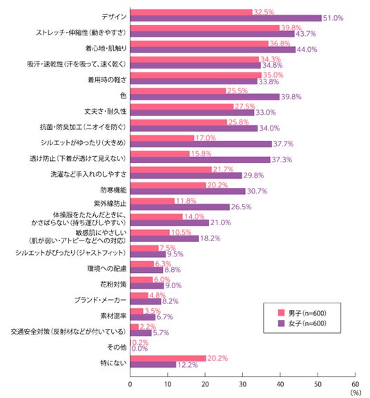 ●男子は「ストレッチ・伸縮性(動きやすさ)」、女子は「デザイン」が最多で、女子は見た目や安心感を特に重視