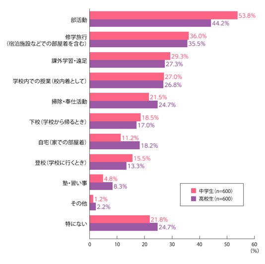 今回、全国の中学・高校生1,200人を対象にした調査では、体育の授業以外での体操服の着用シーンとして、「部活動」(中学生53.8%、高校生44.2%)、「修学旅行(宿泊施設などでの部屋着を含む)」(中学生36.0%、高校生35.5%)、「課外学習・遠足」(中学生29.3%、高校生27.3%)があげられ、学校内だけでなく学校外での体操服の着用も多いことが明らかになりました。