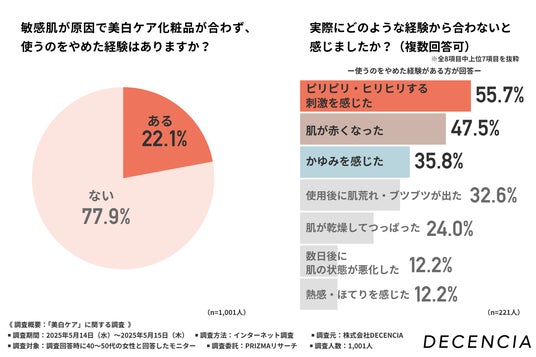 「敏感肌が原因で美白ケア化粧品が合わず、使うのをやめた経験」について、約2割が『ある(22.1%)』と回答し、美白ケアを取り入れても肌に合わず、継続を断念するケースが決して少なくないことが示されました。