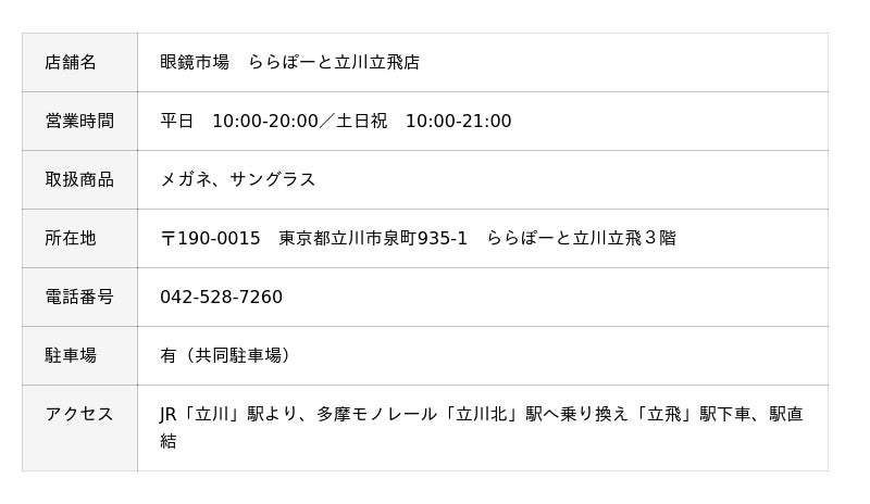 眼鏡市場を全国に展開する株式会社メガネトップ(本社:静岡県静岡市、代表取締役社長:冨澤 昌宏、以下「眼鏡市場」)と、カルチュア・コンビニエンス・クラブ株式会社(本社:神奈川県横浜市、代表取締役社長兼CEO:高橋 誉則、以下「CCC」)、およびCCCMKホールディングス株式会社(本社:神奈川県横浜市、代表取締役社長兼CEO:高橋 誉則、以下「CCCMKHD」)は、3社共創プロジェクトにより「眼鏡市場 ららぽーと立川立飛店」(東京都立川市)を2025年11月21日(金)にリニューアルオープンします。