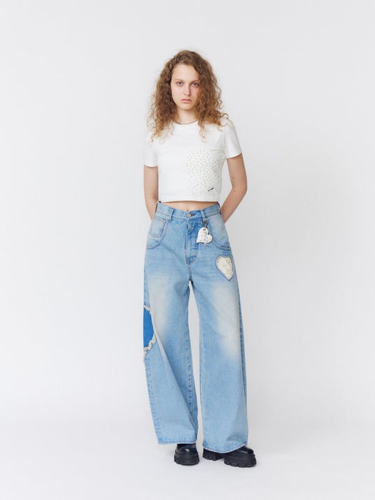 HEART CUT PATTERN T/S ホワイト 4,950円 / HEART LOOSE JEANS アイスブルー 17,380円(全て税込)