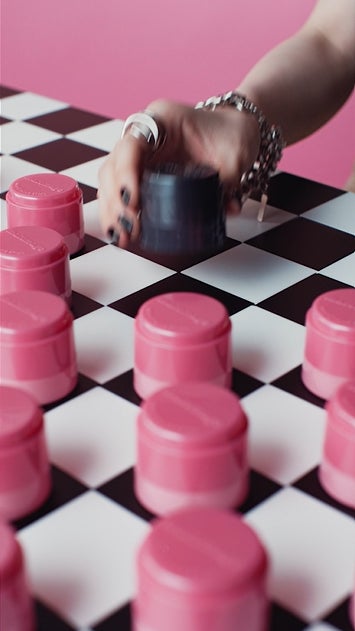 チェスのボードにずらっと並んだピンクのマトメージュ。筒井さんが黒のマトメージュ(=マトメージュオム)で一手を打つと、すべてが黒に変化します。「黒のマトメージュが引き出す芯のある強さ、その強さがいつもの自分を塗り替えていく」のメッセージとともに、マトメージュオムで前髪をととのえた筒井さんが凛としたまなざしを向けて締めくくります。