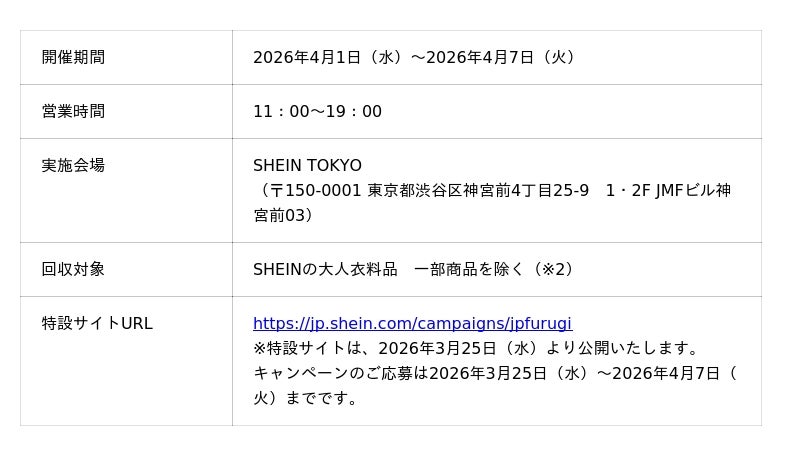 この度、第21弾『#SHEIN Again』を2026年4月1日(水)~2026年4月7日(火)に開催いたします。参加にあたっては、応募ページ(https://jp.shein.com/campaigns/jpfurugi)から事前にお申し込みいただき、あわせてSHEIN公式LINEアカウント(https://page.line.me/142khvkx)を友だち追加してください。その後、「SHEIN TOKYO」へ古着をご持参いただき、店頭でキャンペーンにご参加いただきます。本キャンペーンでは、SHEINでご購入いただき不要となった大人衣料品をお持ちいただいた場合に、代わりにお持ち帰りいただけるアイテム(洋服、シューズ、バッグなど)をご用意(期間中、お一人様1回限りのご参加、最大3点まで)しております。さらに、『#SHEINAgain』を付けてInstagramやXにご投稿いただくと、追加でもう1点のアイテムを交換でき、最大4点のアイテムをゲットすることができます(※1)。着なくなったSHEINの洋服を寄付し、新しい商品をゲットしてみませんか?