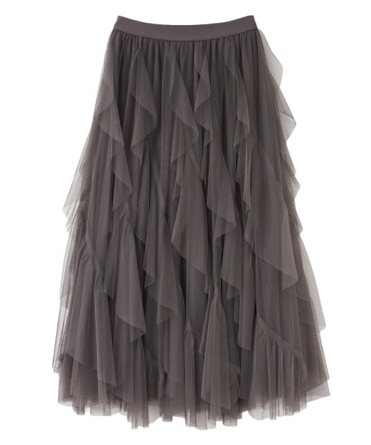 ボリューム感がありながらも、シアーで軽やかなチュール素材を使用し、甘くなりすぎない抜け感を演出できるスカート。