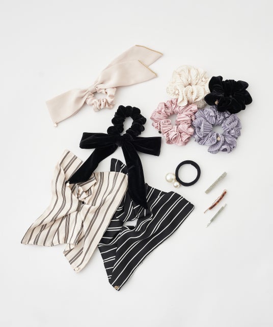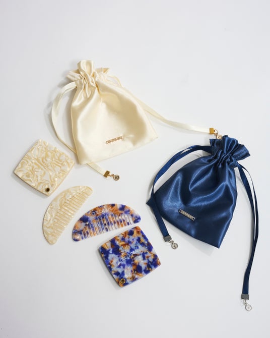 アイボリーにはゴールド、ネイビーにはシルバーのチャームを施した上品な艶感のある巾着ポーチに、配色に拘ったマーブル模様のミラーとコームが入った嬉しいセットアイテム。