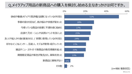 3.メイクアップ用品の新商品への購入を検討し始めるきっかけは「SNSや動画メディアで高評価/話題になっているのを見た」52%