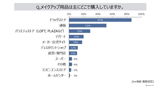 1.メイクアップ用品の主な購入先は「ドラッグストア」87%「通販」52%