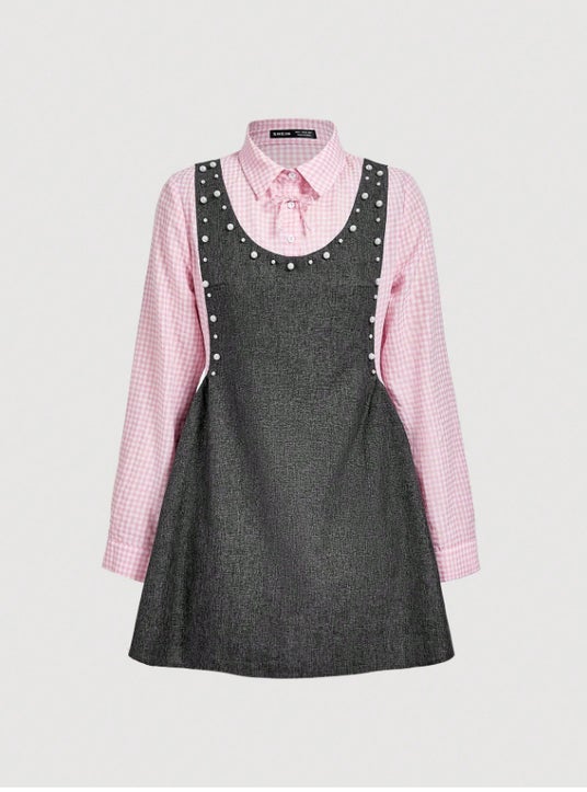 商品名:女性のピンクシャツ&グレータンクドレス、2in1ショートドレス