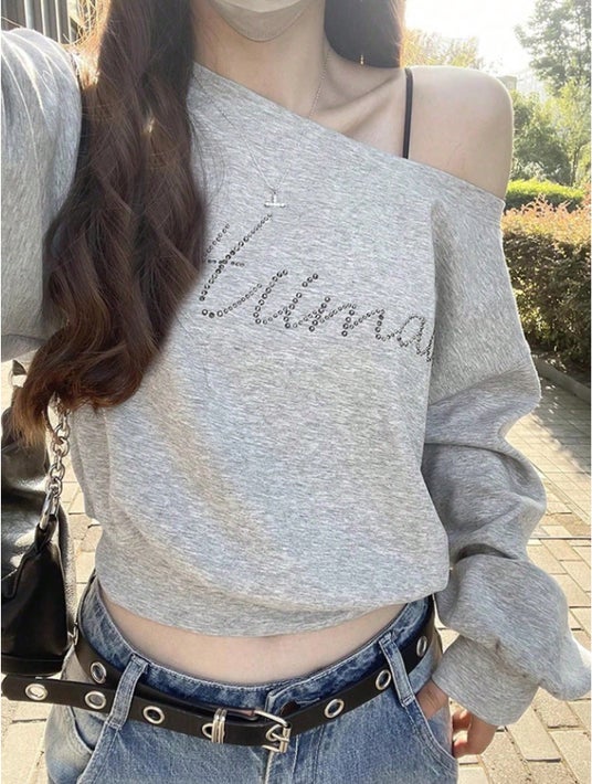 商品名:非対称ネック レタープリント 長袖スウェットシャツ