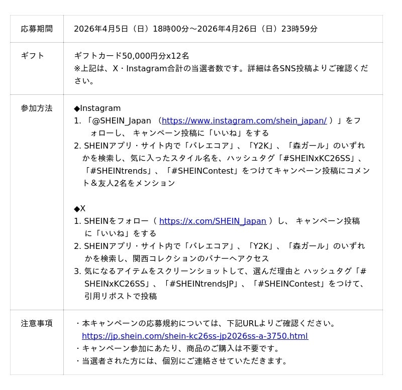 さらに、SHEINの公式SNS(@shein_japan)では、抽選で豪華ギフトが当たるプレゼントキャンペーンを実施します。<キャンペーン概要>