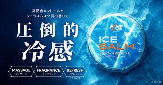 このたび、新たに登場する「FINESPORTS アイスバーム 40g」は、体に塗ってマッサージするだけで筋肉や関節をケアできる、効能と香りを両立した冷感マッサージバームです。高濃度メントールがコールドシャワーを浴びたかのような爽快な清涼感を与え、シトラスムスクの心地よい香りが動いた後でも爽やかにまとえる清潔感を想起させます。