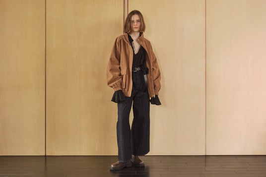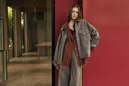 今シーズンのイチオシデニム。フロッキーを吹き付けたオリジナルのデニム生地で製作したセットアップ。起毛感のあるベージュカラーが秋らしいムードに。インナーには素材感のレイヤードを楽しむようにチュールレイヤードのシャツで抜け感を。
