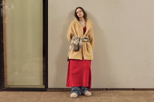 カラーリングもシーズンレスに。目を引くイエローのシャギーコートは今季のアイコンアウター。合わせたレッドのニットドレスとブルーデニムのカラーリングがキャッチーで今季だから楽しみたい合わせに。
