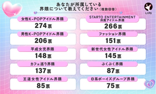 続いてどんな界隈に所属しているのか尋ねてみると、やはり「女性K-POPアイドル」や「STARTO ENTERTAINMENT所属アイドル」などの根強いファンがいる界隈に票が集まる結果に。