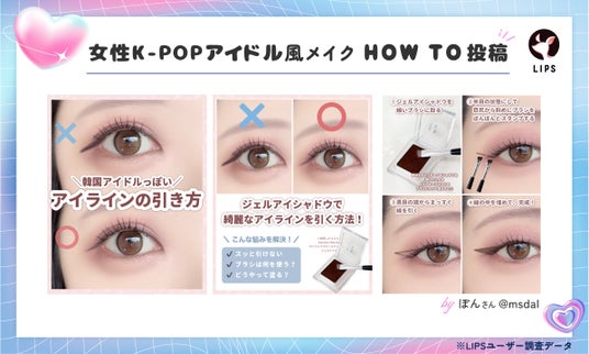 まずピックアップするのは、女性K-POPアイドル風メイクに関するHOW TO投稿。韓国コスメブランド「HOLIKA HOLIKA」の『マイフェイブピースアイシャドウ』を使って綺麗なアイラインを引く方法を紹介しています。