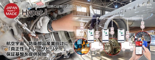 国内・海外訴訟の支援サービスや、知的財産プラットフォーム「Tokkyo.Ai」、ブロックチェーン基盤の電子契約プラットフォーム「Keiyaku CLM」、法令判例検索サービス「Legal Search」、ブランド&知財保護システム「HyperJ.ai」といった、デジタルトランスフォーメーションを実現する次世代の新たなブランド戦略サービスを展開するリーガルテックグループ株式会社(本社:東京都港区、代表取締役社長 佐々木隆仁 以下リーガルテックグループ社)は、子会社会社のJAPAN MADE事務局を通じて、航空宇宙・防衛関連の精密部品を製造・輸出する企業に向けて、部品1点ごとの真正性と製造履歴をブロックチェーンで保証するトレーサビリティ管理基盤「HyperJ」の提供を開始いたしました。