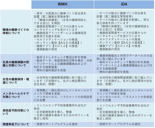WMHおよびiDAは、従業員が生き生きと働ける職場環境づくりに取り組んでおり、従業員の健康促進を目的とした健康支援プログラムの導入を積極的に推進してまいりました。定期健康診断の受診率向上や各種検診の支援、メンタルヘルスケアの充実、ワークライフバランスの推進など、多様な取り組みを継続して行っています。