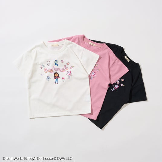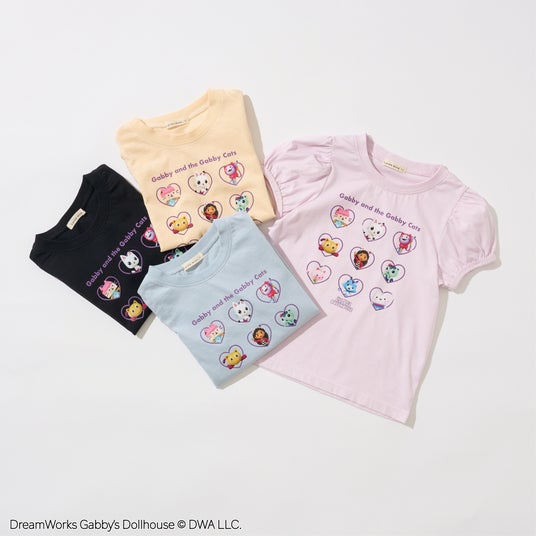 「ギャビーのドールハウス」の元気一杯の「ギャビー」はもちろん、半分パンダで半分ネコのぬいぐるみ「パンディ・ポーズ」や小さくてわんぱくなカップケーキの男の子「ケーキー」など、可愛いキャラクターたちがプリントされたベーシックスリーブのTシャツ。
