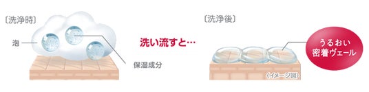 ・独自の「うるおい密着ヴェール」。すすぎ時に、保湿成分が肌に密着しやすいヴェールに変化し、全身にうるおいを与えます。