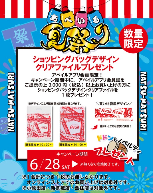 6/28(土)に税込3,000円以上お買い上げのうえ、アプリ会員証をご提示いただいたお客様に、ショッピングバッグデザインの「クリアファイル」をプレゼント。