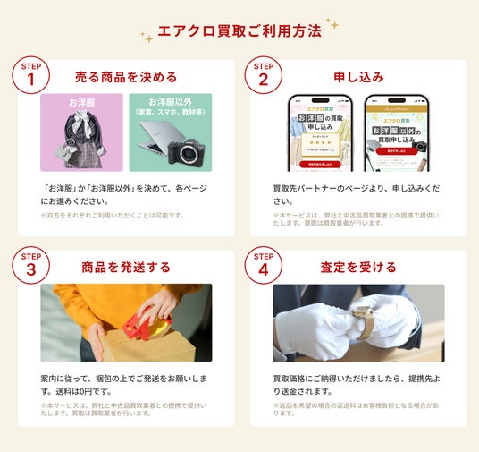 近年、自宅にある衣類や家電などを有効活用したいというニーズが高まっています。「まだ使えるものを廃棄せず、次の使い手へ循環させたい」という意識の広がりとともに、リユース市場は拡大を続けています。さらに、環境省様によるリユース促進の取り組みや、経済産業省様による循環経済(サーキュラーエコノミー)への転換方針の提示など、社会全体で資源循環を後押しする動きも加速しています。こうした背景を受け、当社は買取サービス「エアクロ買取」の提供を開始いたしました。株式会社トレジャー・ファクトリー様および株式会社マーケットエンタープライズ様との連携により、衣類に加え、家電や雑貨まで幅広い品目の買取に対応いたします。