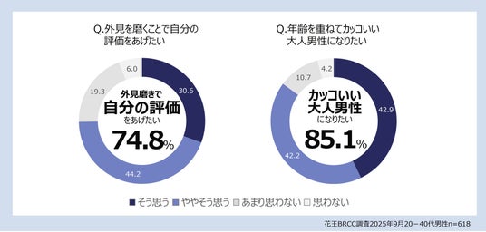 「外見磨きで自分の評価をあげたい」74.8%、「年齢を重ねてカッコいい大人男性になりたい」85.1%と、自分の印象をより良くしたい意識が高いことが確認されました。