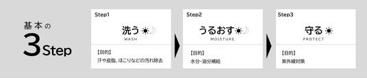 肌をすこやかに整える鍵は、毎日のスキンケアにあります。1.やさしく洗う、2.ムラなくうるおす、3.紫外線から守る――まずはこの基本を習慣に。
