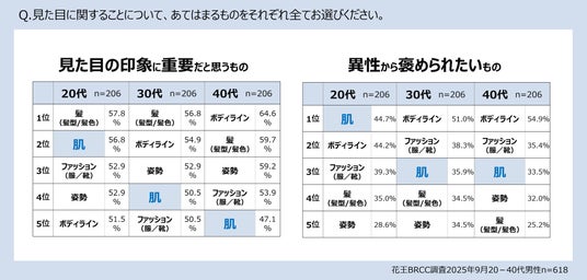 20代では、見た目の印象に重要な要素として“肌”が2位。また「異性から褒められたいもの」では20代で“肌”が1位、30~40代でも3位に入り、年代を問わず”肌“が印象づくりに関わる要素として意識されていました。