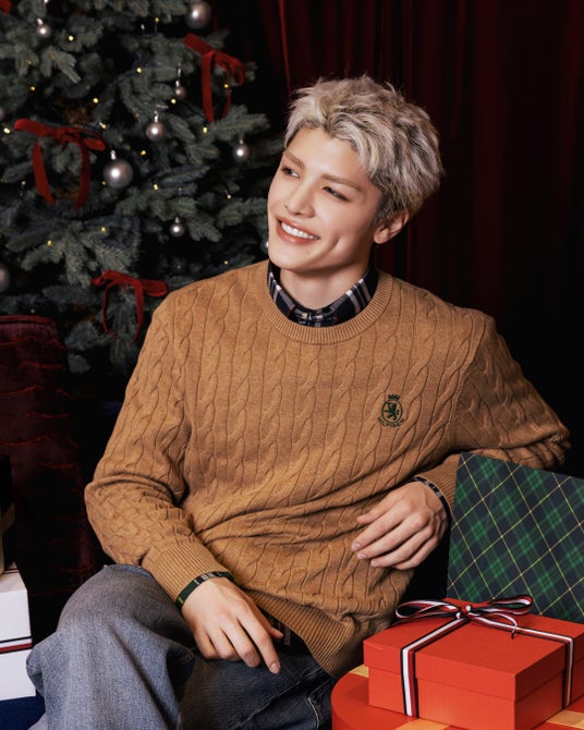 アーティストの宇野実彩子(AAA)はクロップド丈のネイビージャケットにゴールドボタンを効かせたプレッピースタイルを中心に、ミニプリーツスカートとベージュのフリンジローファーで軽やかな印象を演出。さらに、ソフトなウールのケーブルニットセーターやコーデュロイのミニスカート、ロゴ入りビーニーを合わせ、ホリデーらしい温もりと遊び心を感じさせる装いに仕上げています。