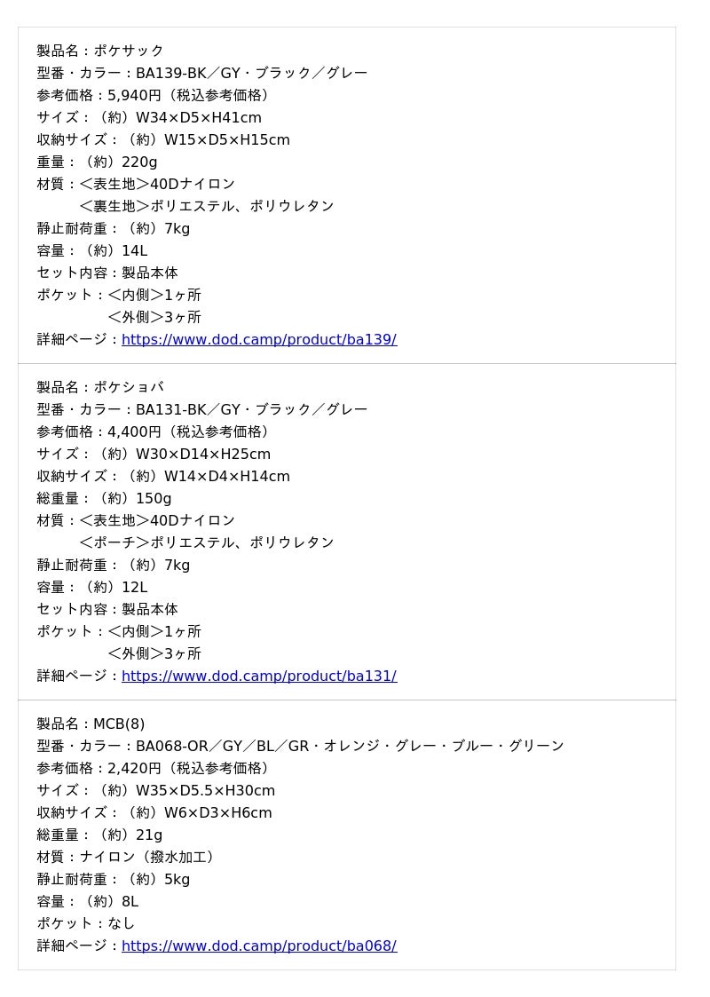 ビーズ株式会社(本社:大阪府東大阪市、代表取締役社長:大上響)が展開するアウトドアブランドの「DOD」は、「畳んだ時の可愛さと、使う時の実用性」を追求したウルトラライトシリーズ「ポケサック」「ポケショバ」と、および重量わずか21gのエコバッグ「MCB(8)」を2026年2月9日より発売しました。