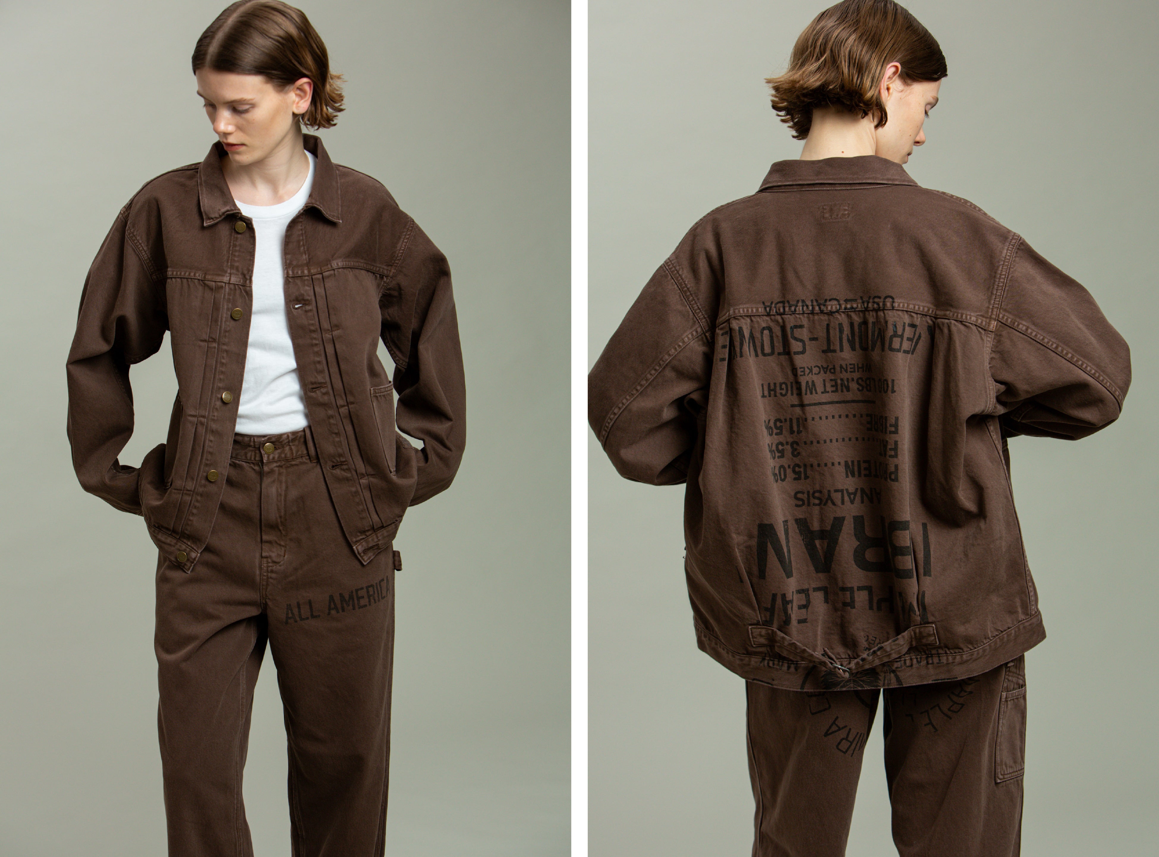新作は、1950年代のデニムジャケット、1960年代のペインターパンツをベースとして現代的にアレンジ、抜け感のあるシンプルな印象に仕上げています。縫製はあえてラフに仕上げて大量生産していた時代のラフな雰囲気を忠実に表現しました。硫化染めを施したブラウンカラーで、ストーンウォッシュ加工でさらにユーズドライクな雰囲気が特長です。