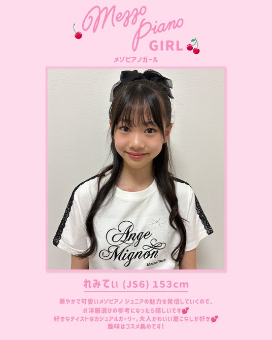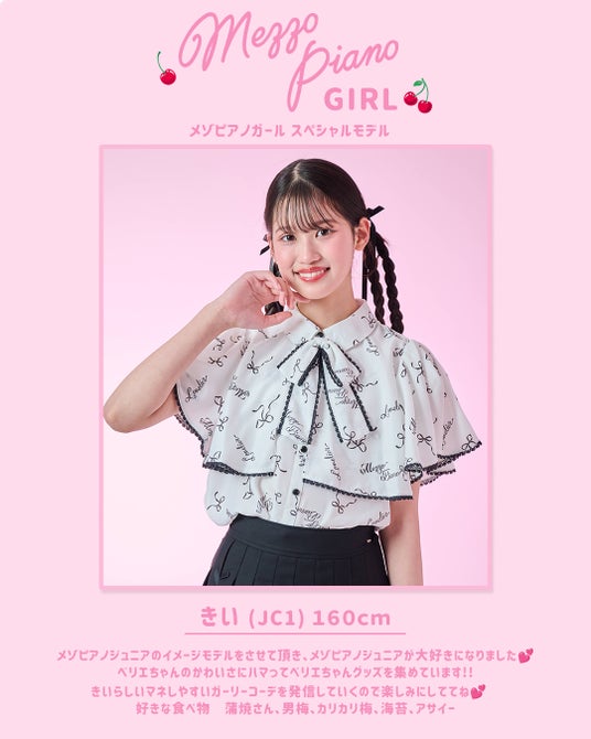 第1期 メゾピアノガールの活動をリードする存在として、小中学生向けファッション誌『Cuugal(キューーガル)』専属モデルであり、2024年秋冬よりメゾピアノ ジュニアのイメージモデルも務めた小日向 希衣(こひなた・きい)ちゃんが、メゾピアノガールスペシャルモデルとして就任!