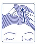 2. 1剤と同じ方法で2剤(薬用育毛剤)も続けてご使用ください。1剤と2剤の間隔を空ける必要はありません。額の生え際から後頭部に向かって5~7本ほど線を引くように塗布します。