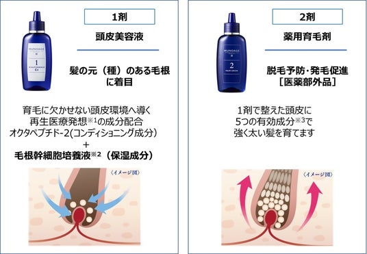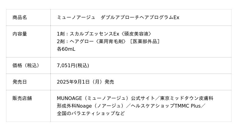 リゾートトラスト株式会社のグループ企業である株式会社アドバンスト・メディカル・ケア(東京都港区、代表取締役社長:古川哲也)は、再生医療※1発想のコスメブランド「MUNOAGE(ミューノアージュ)」から、頭皮美容液と薬用育毛剤(5つの有効成分※3配合)の2剤構成が実現する高い効果体感によって、多くのお客様から高い支持を得ている育毛剤をリニューアル発売します。ブランド史上初となる毛根幹細胞培養液※2を新たに配合した「ミューノアージュ WアプローチヘアプログラムEx」(1剤:スカルプエッセンスEx〈頭皮美容液〉、2剤:ヘアグロー〈薬用育毛剤〉【医薬部外品】各60mL、税込7,051円)として、2025年9月1日(月)から発売を開始します。